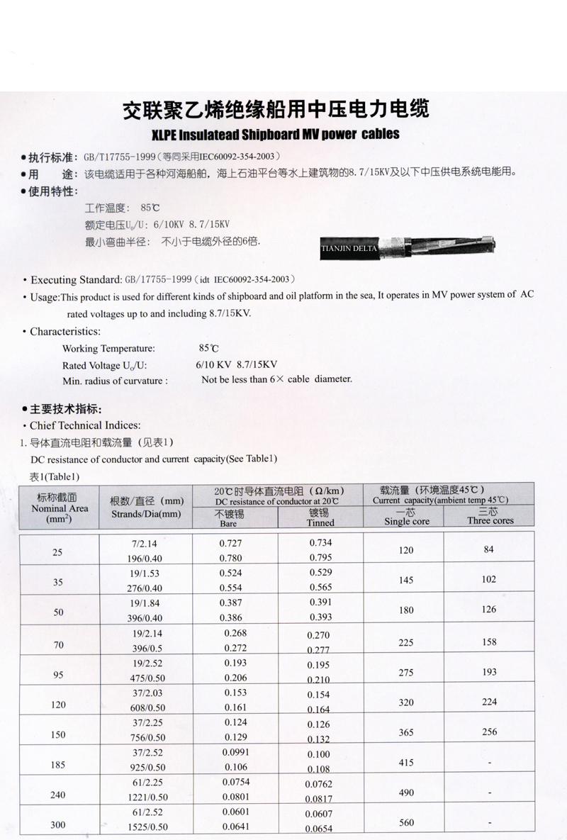 交联聚乙烯绝缘船用中压电力电缆